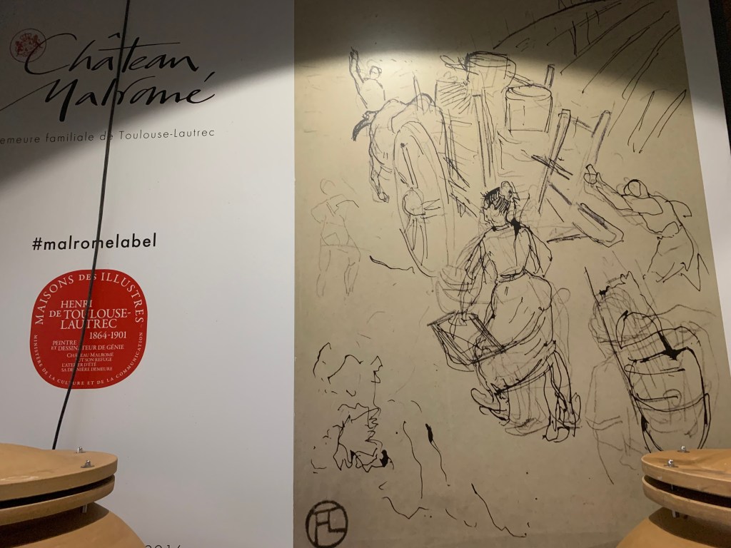 In the gallery below, see the amphora being used experimentally to mature the blend. The chateau produces red, white and rosé, now under the etiquette ‘Toulouse-Lautrec’, as it was the chateau of Henri’s mother, Adèle. See too Henri’s childhood drawing hidden behind a door and a reproduction showing his fondness for red-heads, presented by the chateau’s own redhead.