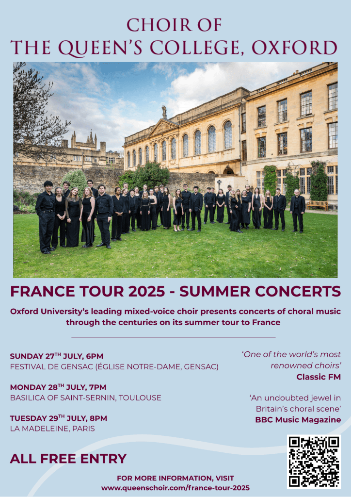 The Queen College choir will be singing madrigals at Saint Sernin in Toulouse starting at 7 p.m. Entrance is free with a retiring collection. The concert is open to all and should be an exceptional opportunity to hear these Renaissance part-songs, typically unaccompanied and arranged in elaborate counterpoint.